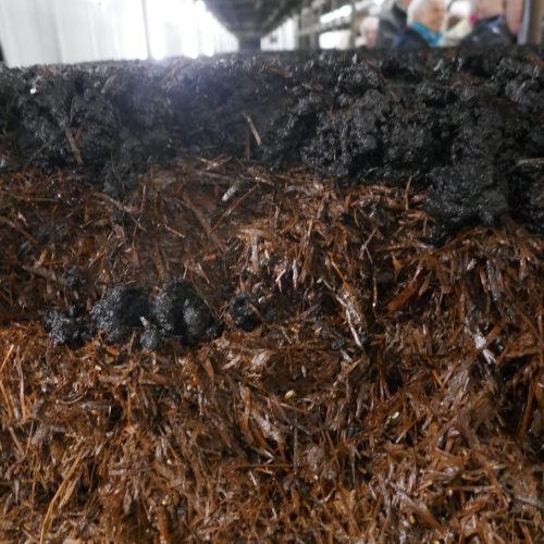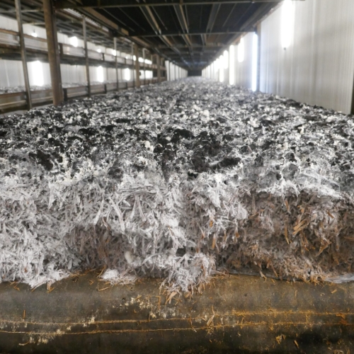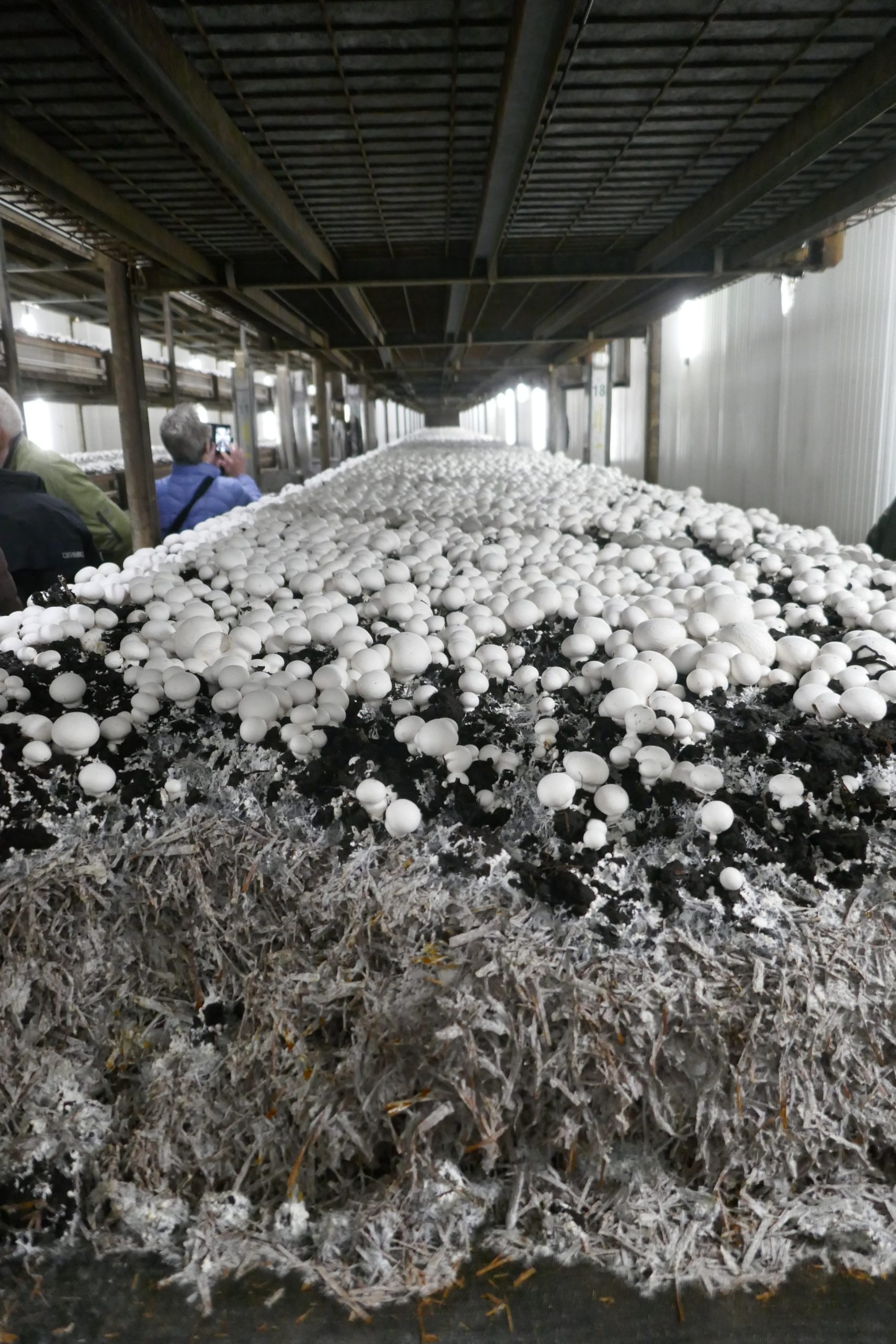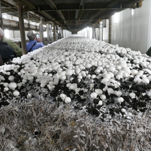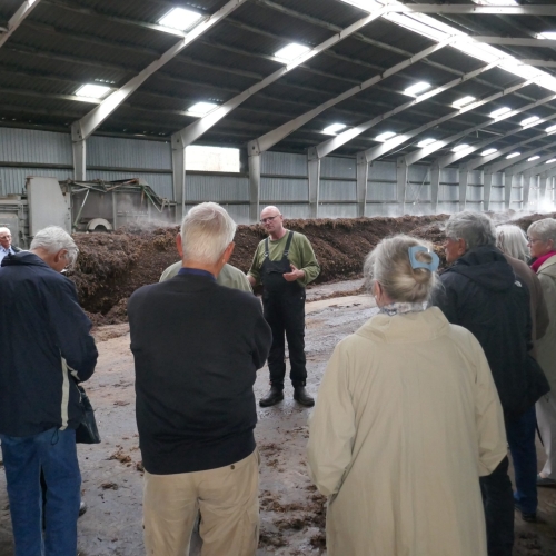 Efter det spændende foredrag fik vi en rundtur i produktionen, startende ved kompost- lagerpladsen. Komposten er værdifuld gødning til landbruget, anlægsgartnerier og private havedyrkere. Herefter så vi komposteringsprocessen og dyrkningen af champignon i hallerne, hvor vi så produktion netop sat i gang, efter 3-4 dage, og efter 6 dage hvor tynding og høst begynder. Herefter en tur i forædlingsafdelingen samt lageret.