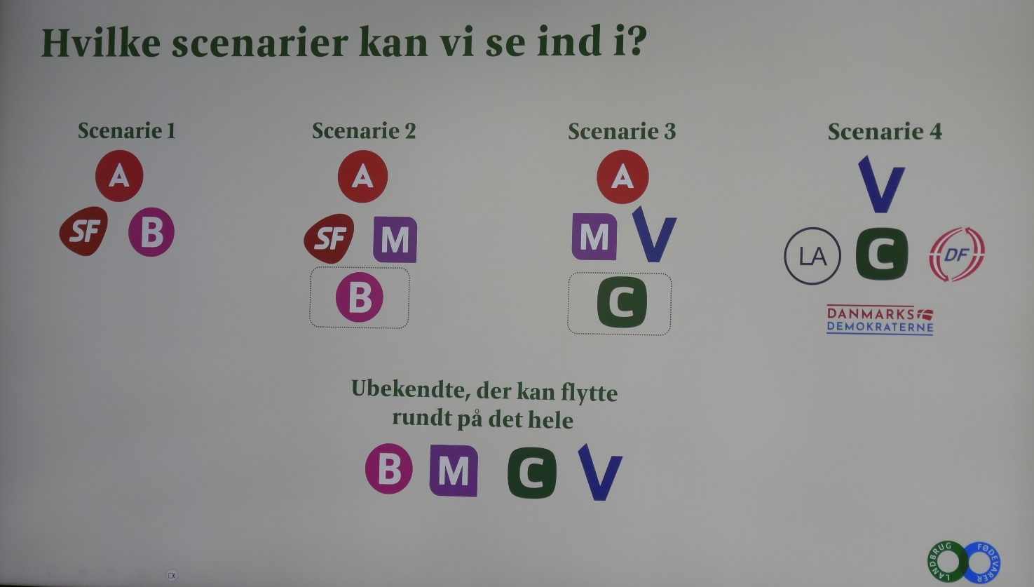 SVM-regeringen var en god ting for landbruget, og Mette Frederiksen, og for hende og Socialdemokratiet er det vigtigt at beholde statsministerposten, men det kan blive meget vanskeligt, da valgresultatet kan ende med mange kombinationsmuligheder.